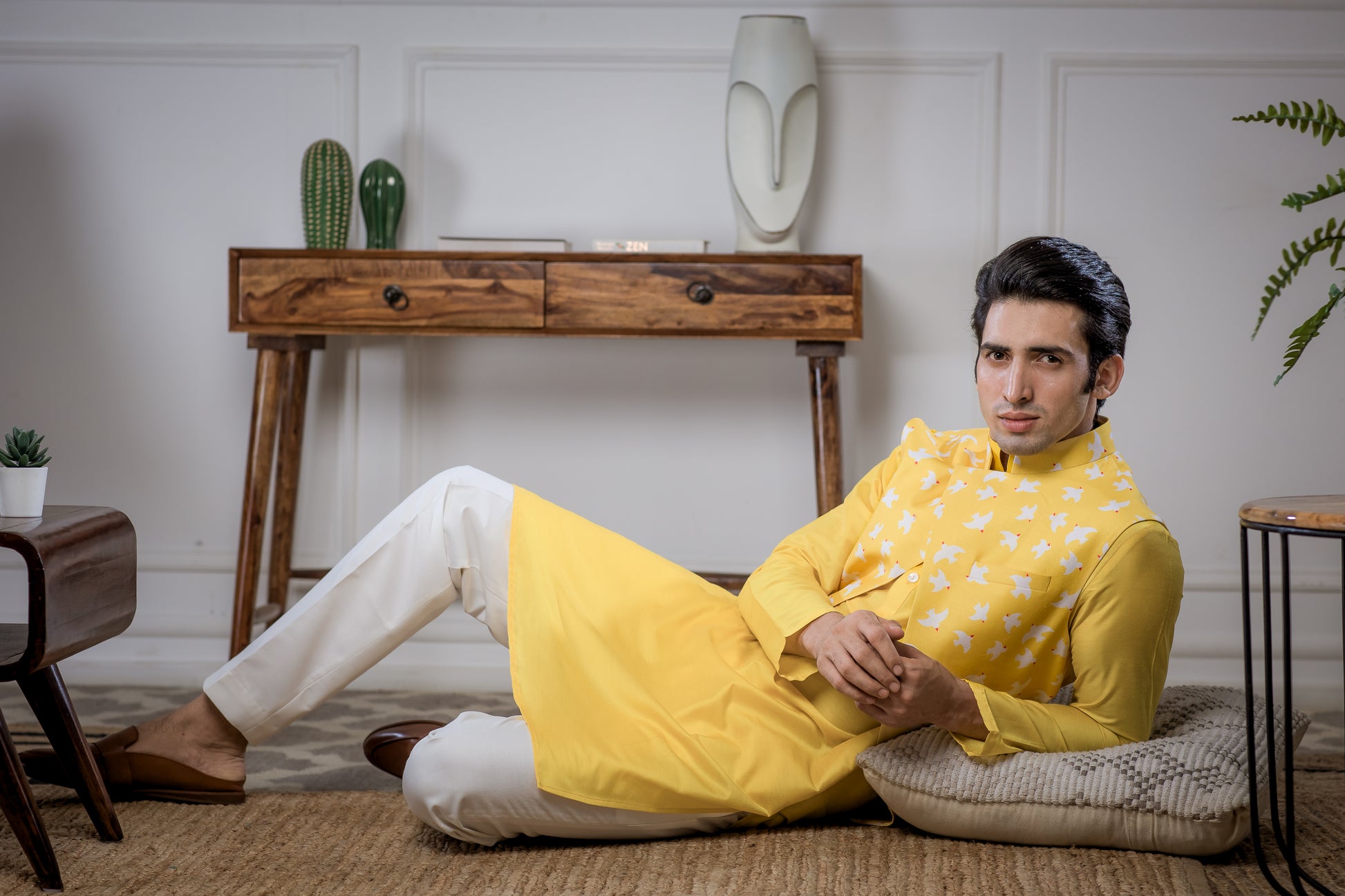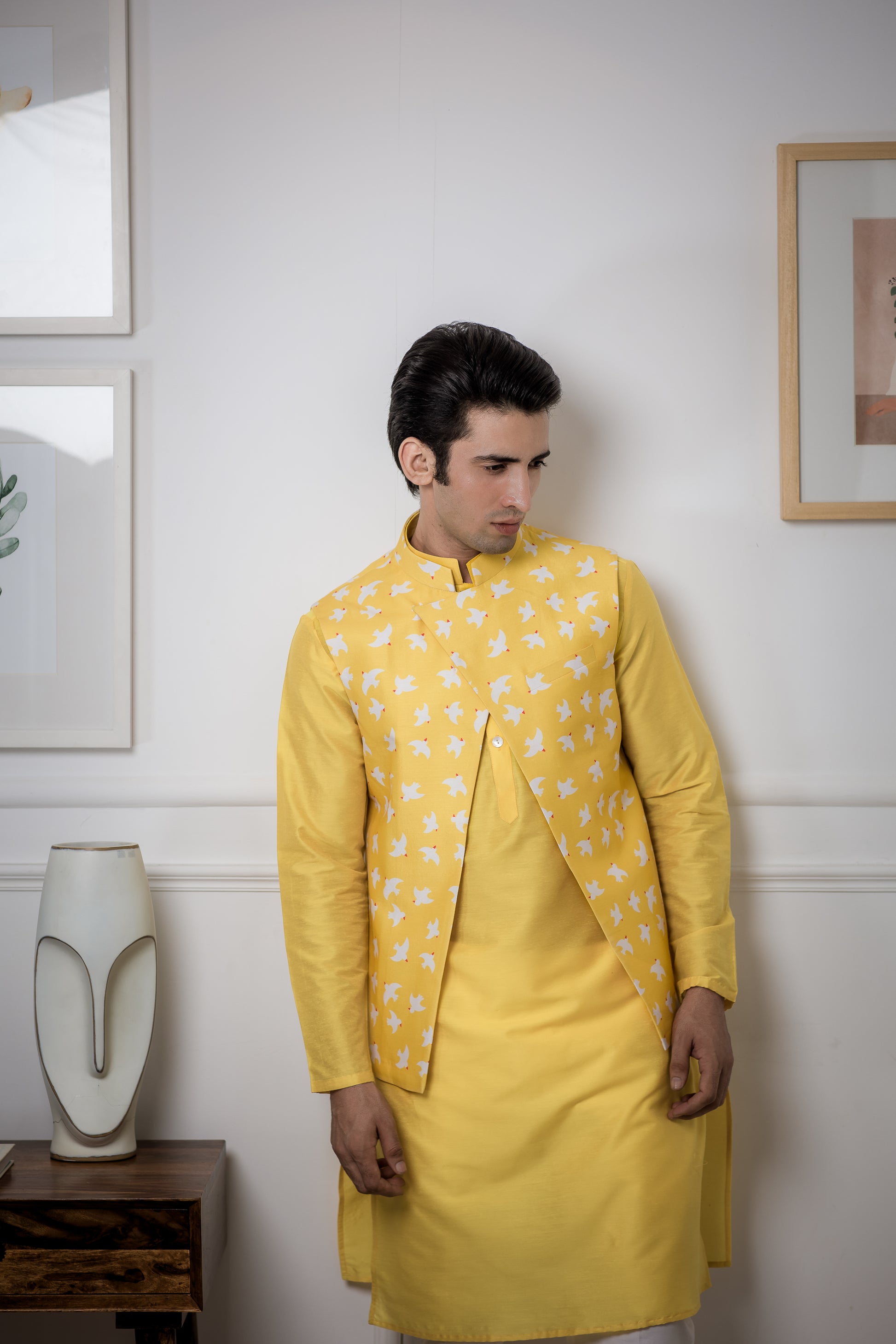 Embrace a rich minimalist look with our playful Chirpy Yellow Birds - Nehru Jacket; handcrafted by our skilled artisans for an elegant and comfortable fit and perfect for all occasions